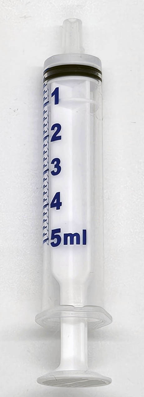 Clear oral syringe with tip caps not attached. Latex free. 5ML, 100/bag.